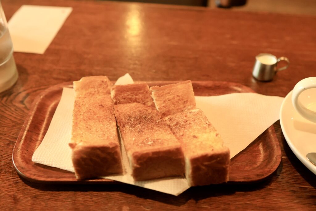 バタートーストは5枚切りくらいの厚みで3分割されています、耳は2辺ありません。バターが染みていて美味いです。