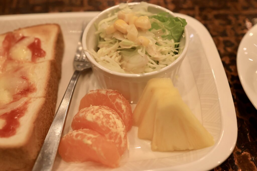 サラダはコーンとキャベツ、キャベツの千切りに胡麻ドレッシングがかかっています。フルーツはミカンとパイナップルでした。