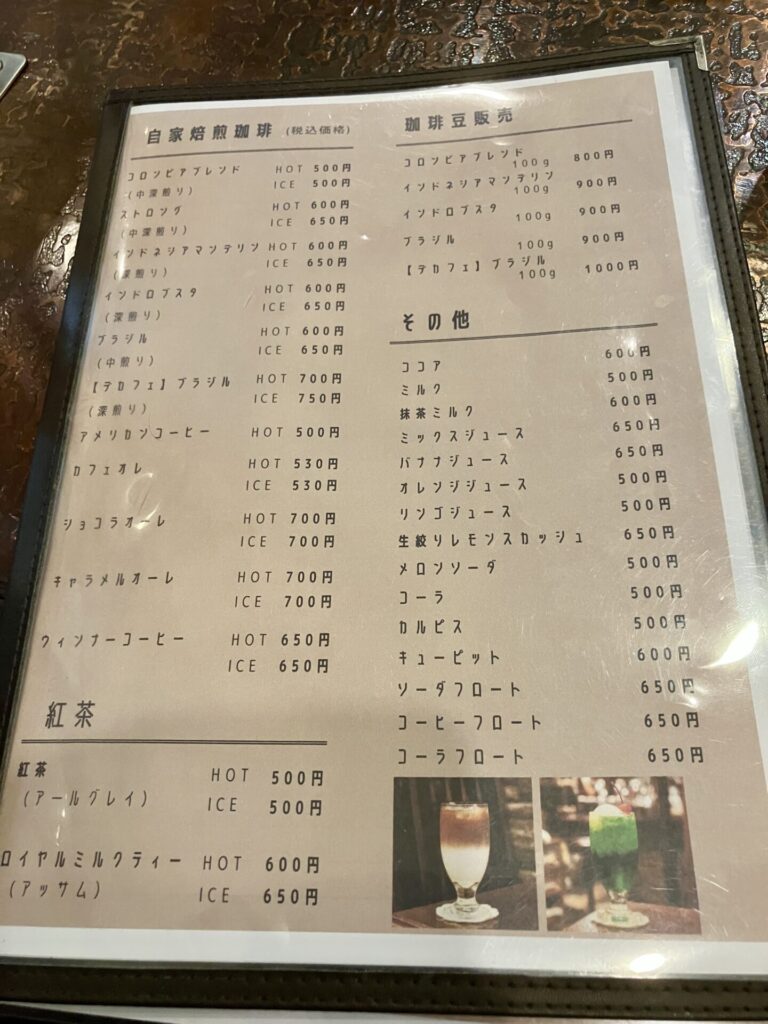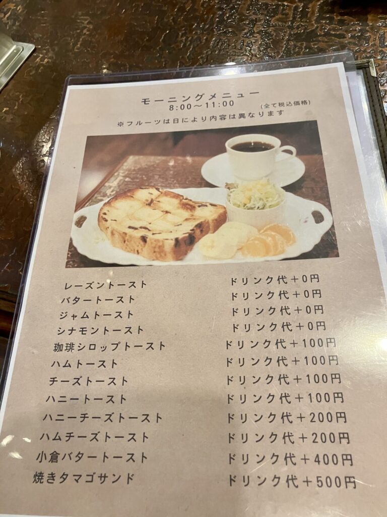 トースト系のモーニングはドリンク代+追加のモーニング代となっています。ドリンクメニューは500~700円です。