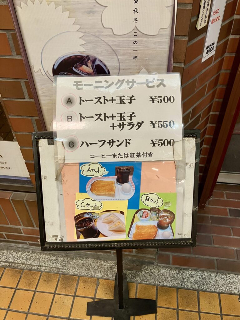 こちらのモーニングは3種類です。Aセット:トースト、玉子500円、Bセット:トースト、玉子、サラダ550円、Cセット:ハーフサンド500円。ドリンクはコーヒーまたは紅茶です。
