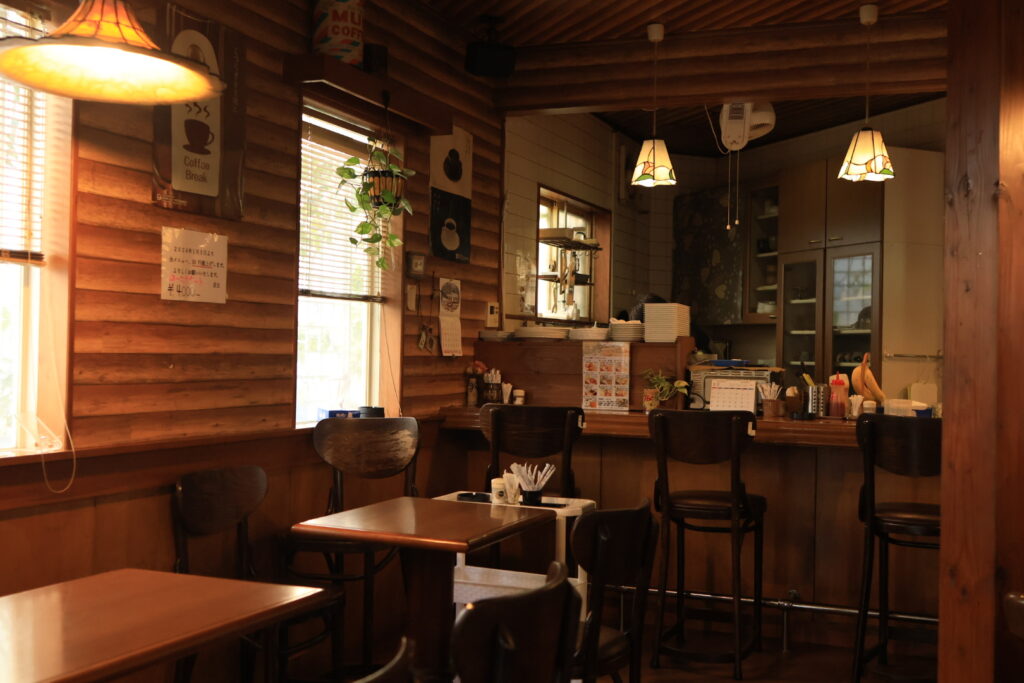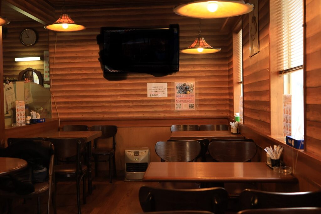 店名を反映してか店内はログハウス調の内容になっています。カウンター4席、2人席×2、4人席×5となっており、割と広い店内ですが、いつもお客さんで埋まっているイメージがあるお店です。
