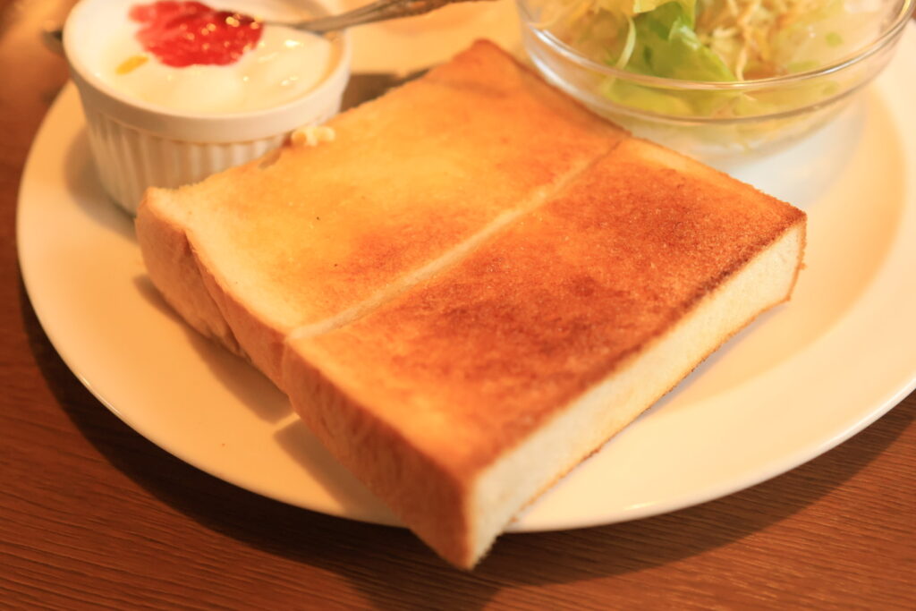 バタートーストは5枚切りくらいの厚みで2分割されています。耳は2辺残っています。カリッとした歯応えが良いですね。