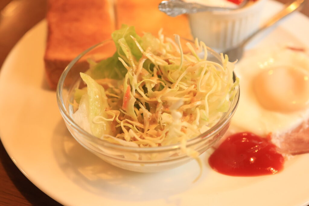 サラダはキャベツ千切り人参付きとレタスに胡麻ドレッシングがかかっています。