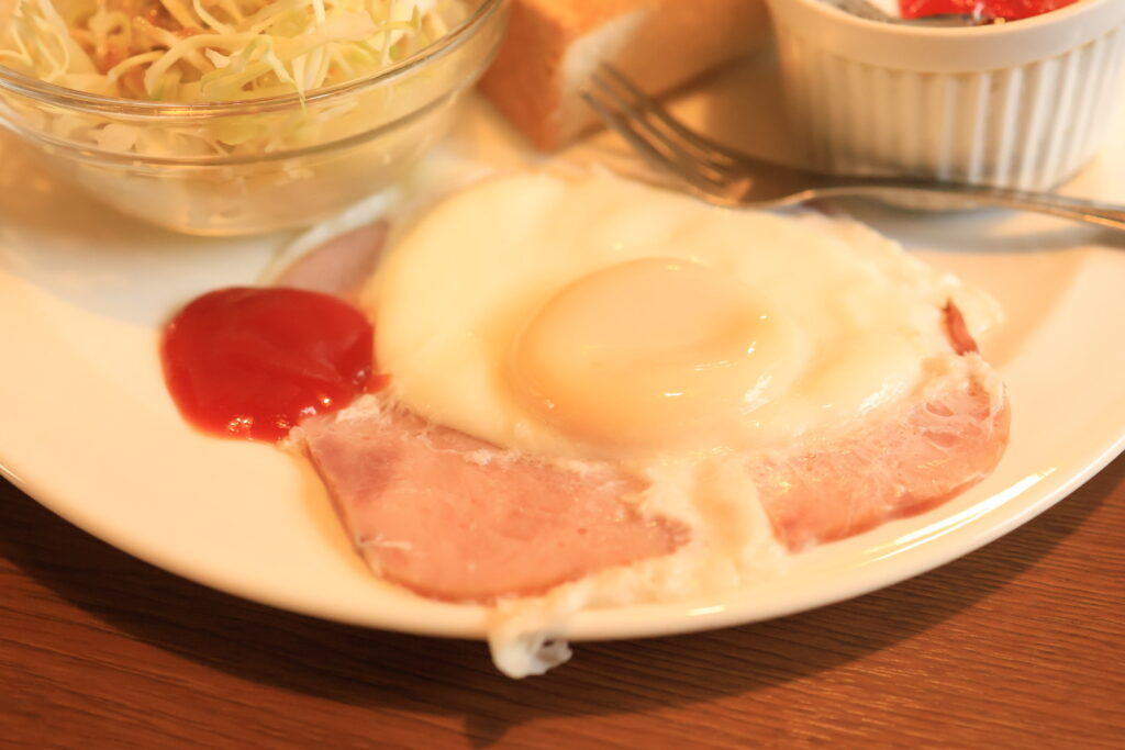 ハムエッグにはケチャップが付いています、目玉焼きは半熟部分あり。