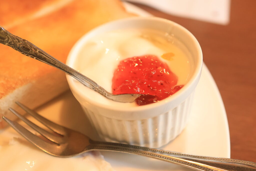 ヨーグルトにはイチゴジャムが乗っていて、とろみのあるヨーグルトの下にはミカンなどの果物が敷いてあります。