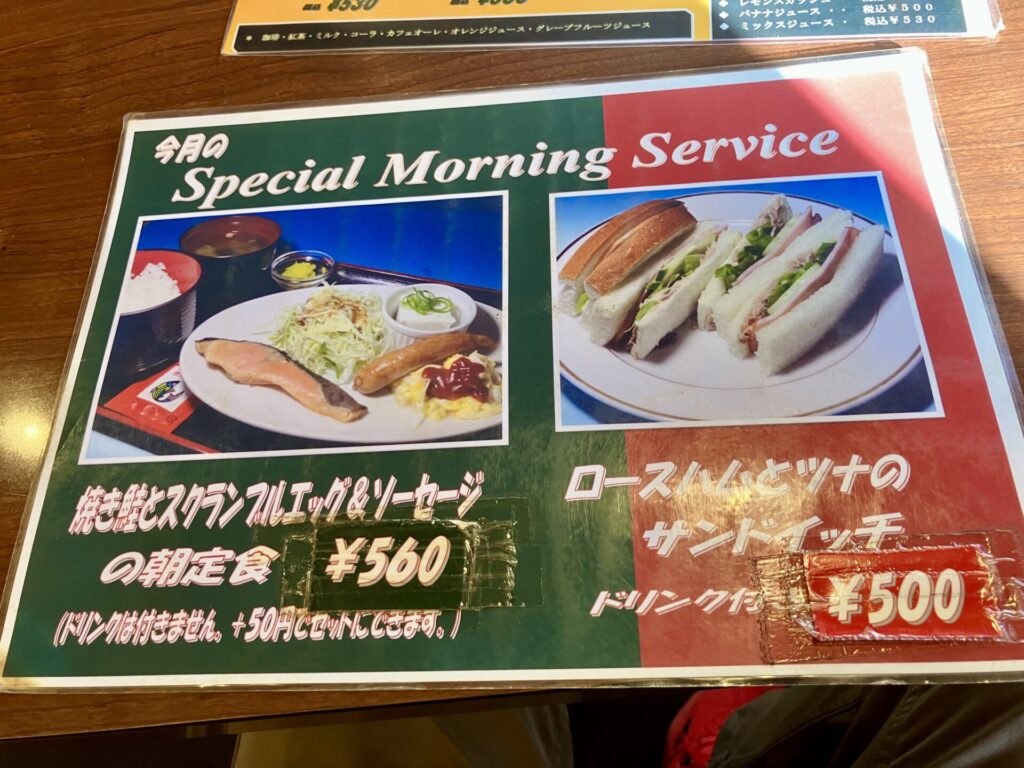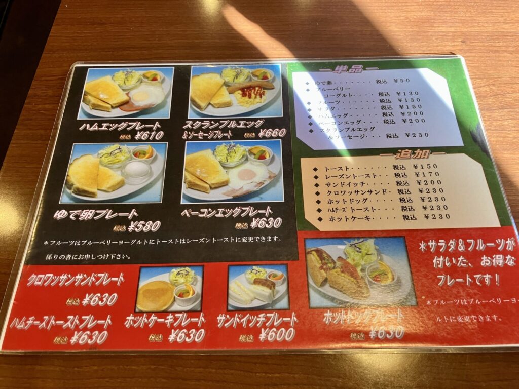 店内は2階に2人席×1、4人席×7、1人席多数と広いですがカウンター席はありません。1階も多くの席があります。こちらのモーニングは種類が多く、和定食も1種類ありますね。どれにしようか・・・