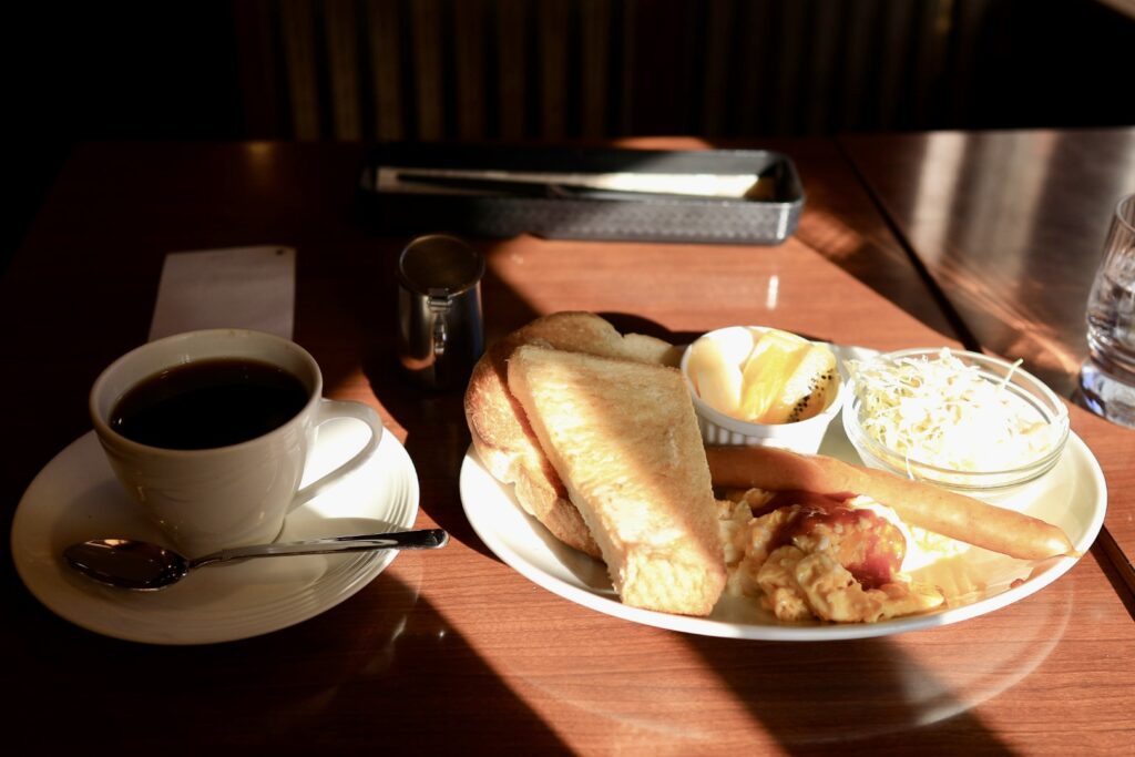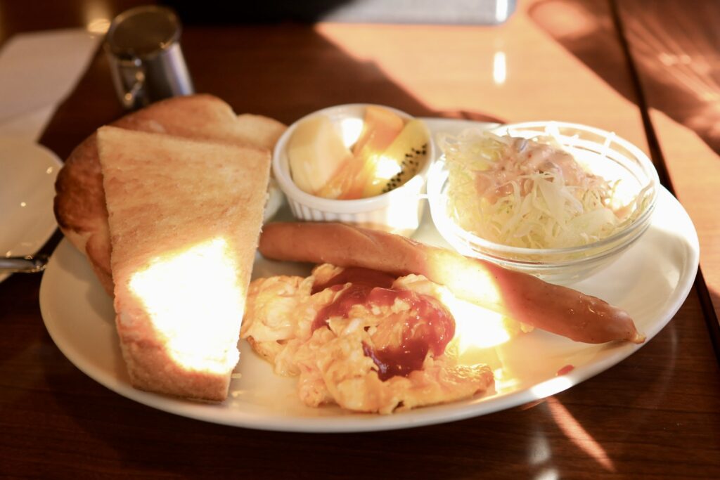 トーストは6枚切りくらいの山食で2分割されています。耳は3辺付いていて、カリッとした食感です。スクランブルエッグにはケチャップが乗っています。ソーセージをお供に頂きます。サラダはキャベツの千切りにオーロラドレッシングがかかっています。フルーツはキウイ、ミカン、パイナップルが入っていました。
