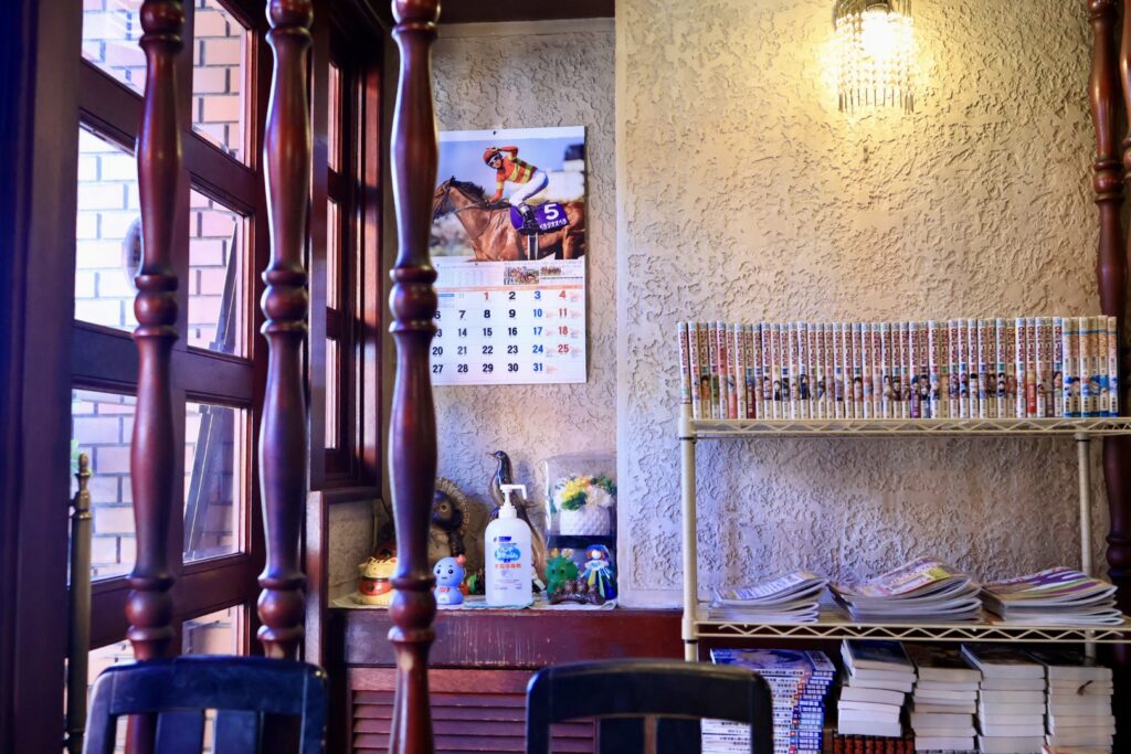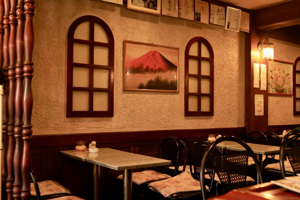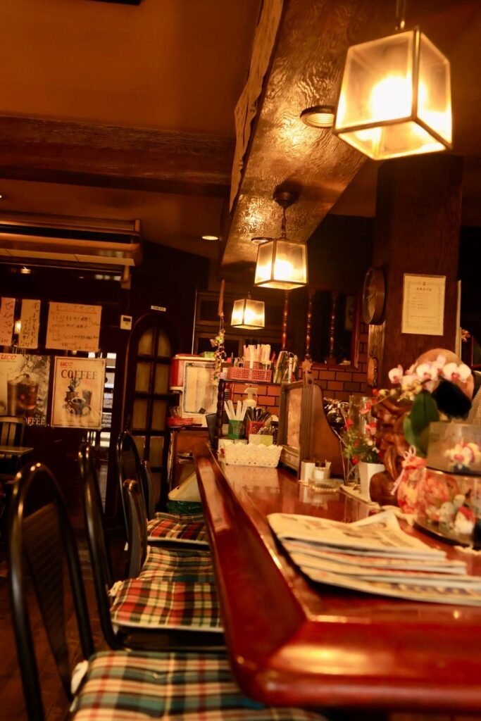 昔ながらの雰囲気の喫茶店ですが、窓が大きく店内は明るいです。カウンター上にある3つのランプが良い雰囲気を醸しています。店内はカウンター5席、2人席×1、4人席×4となっています。