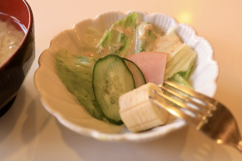 サラダはレタス、キュウリ、ハムに胡麻ドレッシングがかかっています。ここにバナナも1切れ入っていました。