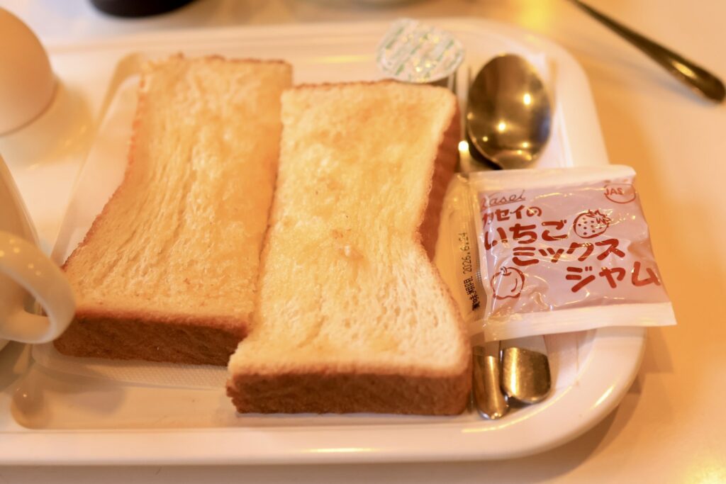 トーストは6枚切りくらいの厚みで2分割されています。別添えのジャムも付いてきます。耳は全て付いていて軟らかい歯応え。ゆで卵は剝きやすいです。