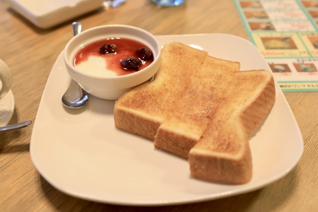トーストは6枚切りくらいの厚みで3分割されています。耳は全て付いています。割とカリッとした焼き上がりです。ヨーグルトはイチゴソースと冷凍ブルーベリーが乗っていました。