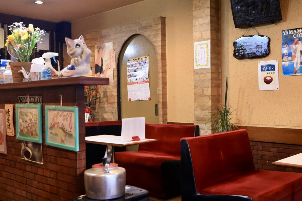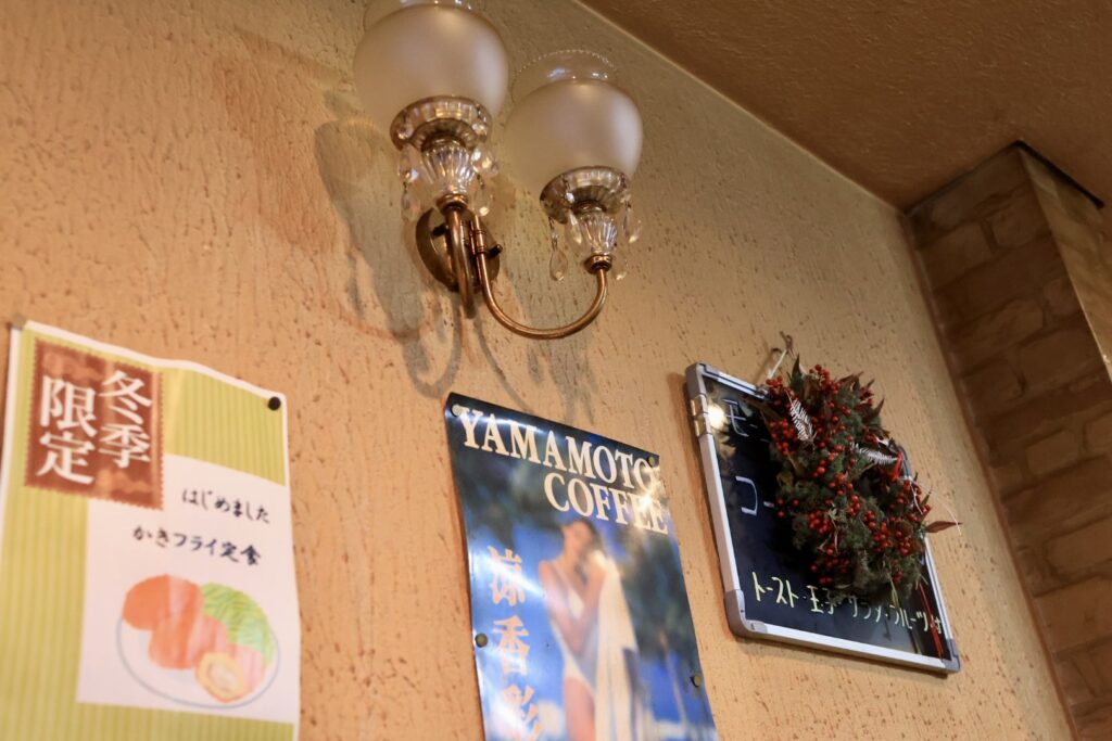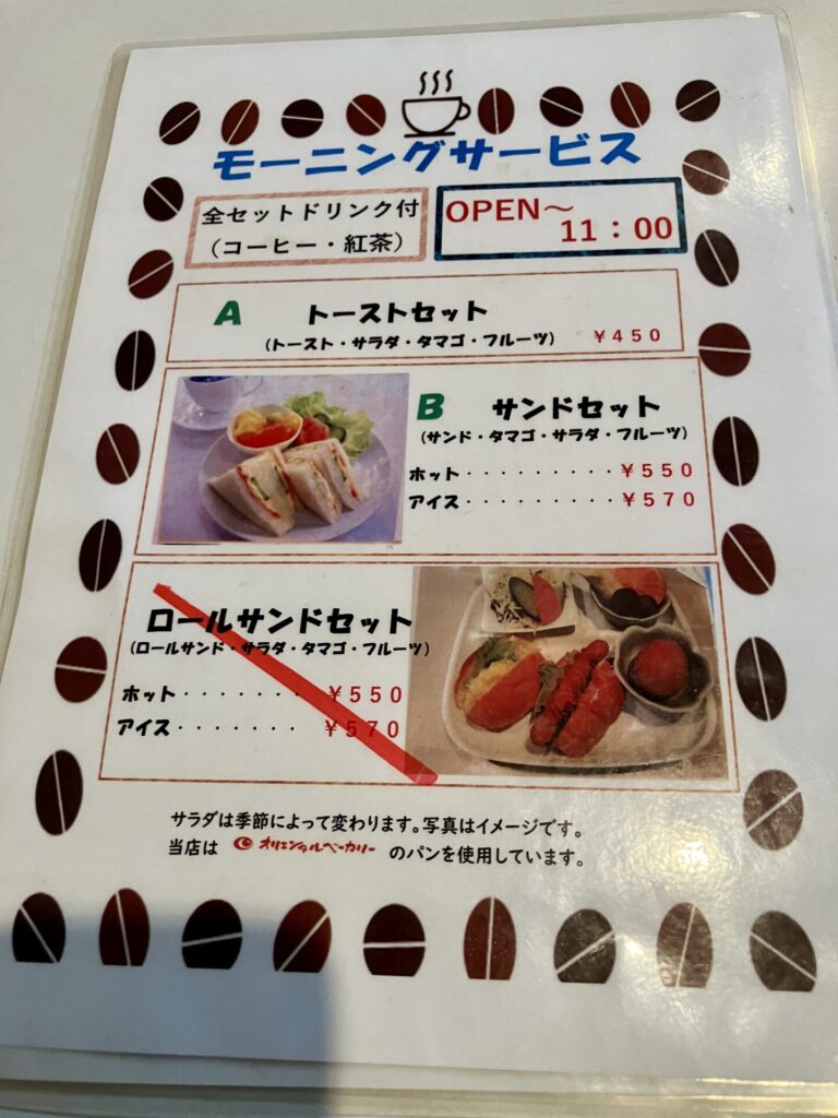 店内はカウンター席なし、4人席×7となっています。こちらのモーニングは現在2種類で、ロールサンドセットは提供されていないようです。