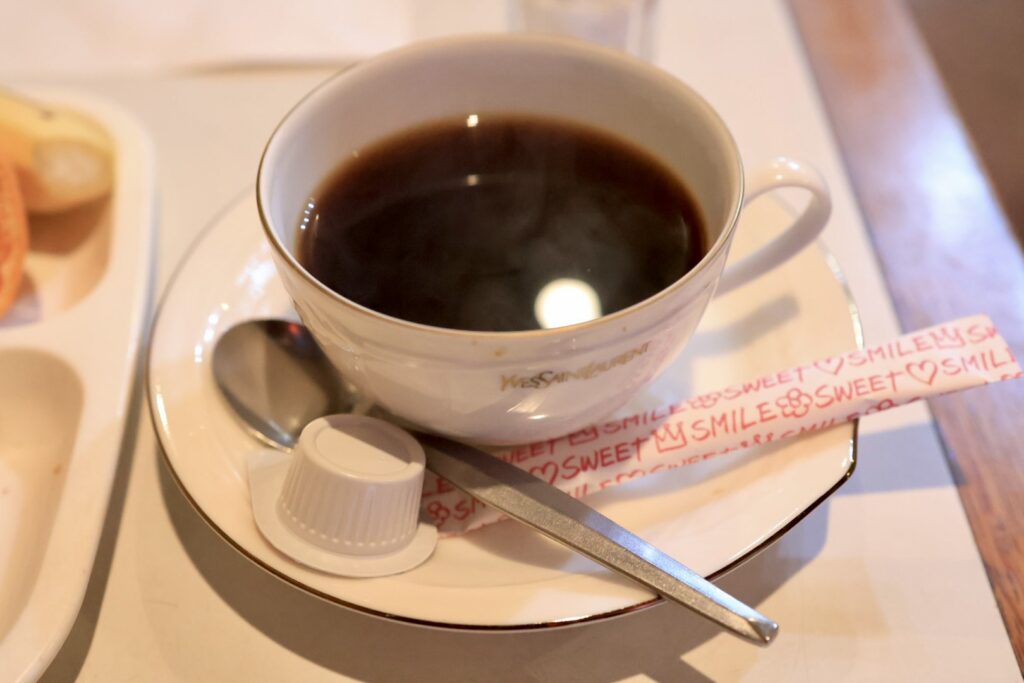 イブ・サンローランのカップとソーサーに入ったコーヒー、ほんのりとした酸味が香り、酸味と柔らかな苦みを感じる味わいです。なかなかに味わい深いです。