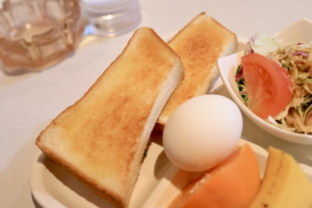 トーストは5枚切りくらいの厚みで2分割されています。耳は全て付いています。小麦の旨味を感じるパンです。