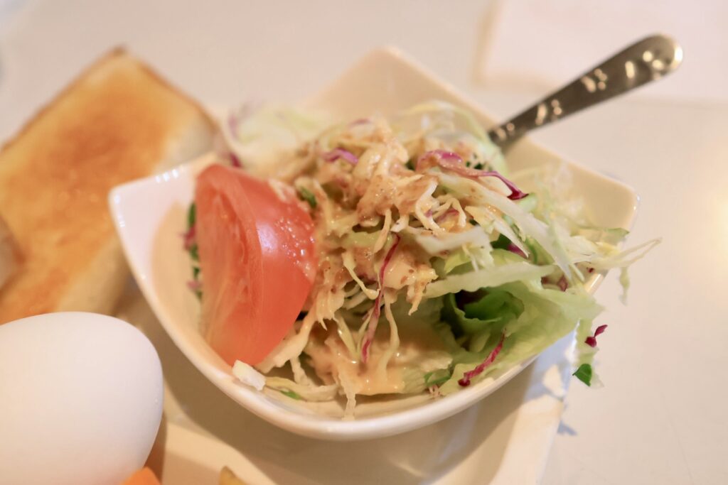 サラダは千切りキャベツと水菜、トマト1切れが入っていて、胡麻ドレッシングがかかっています。ゆで卵は剥きやすかったです。
