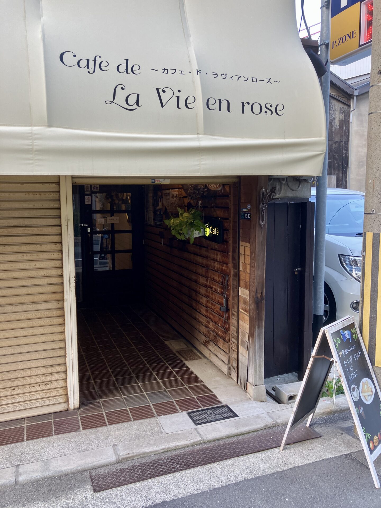 何だかシャッターが半分以上閉まっていますが・・・モーニングの看板は出ていますね。「バラ色の人生」という意味の店名ですが、中はどうでしょうか。入ってみましょう。