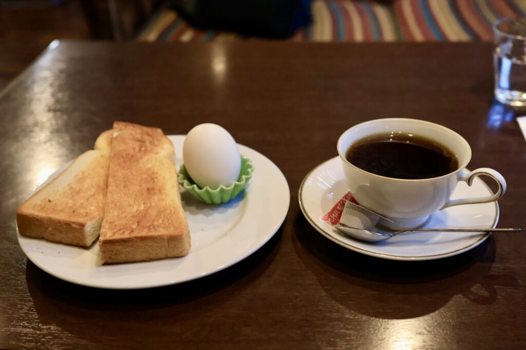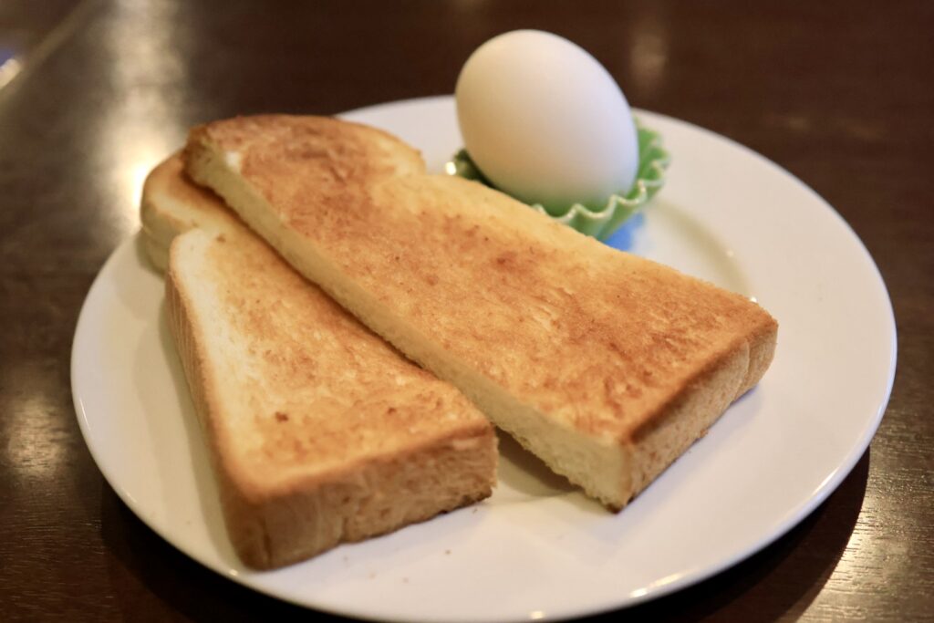 トーストは6枚切りくらいの厚みの山食で2分割されています。耳は全て付いています。軟らかめの食感に焼き上がっています。耳の香ばしさとバターが良く合いますね。ゆで卵は剥きやすかったです。