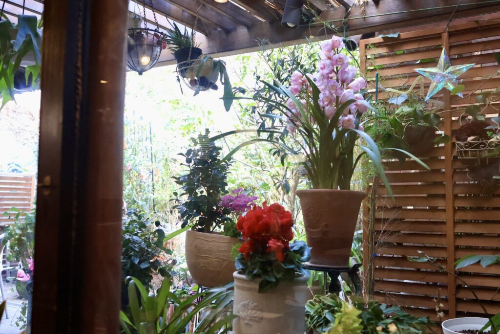 店内はカウンター席無し、1人席×1、2人席×5、3人席×1、5人席×1となっています。思った以上に広く、軽快なBGMがかかる店内は落ち着ける雰囲気。お庭にはお花も飾ってあります。