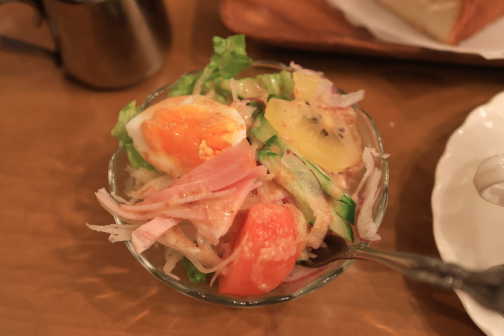 サラダは玉ねぎ、きゅうり、レタス、トマト、カットゆで卵、ハム、キウイに胡麻ドレッシングがかかっています。見た目以上にボリュームがあります。