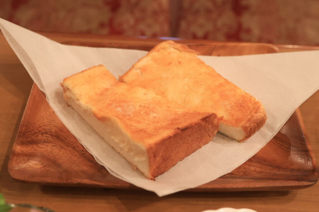 トーストは4枚切りくらいの厚みで2分割されています。耳は2辺付いています。軟らかめの食感です。