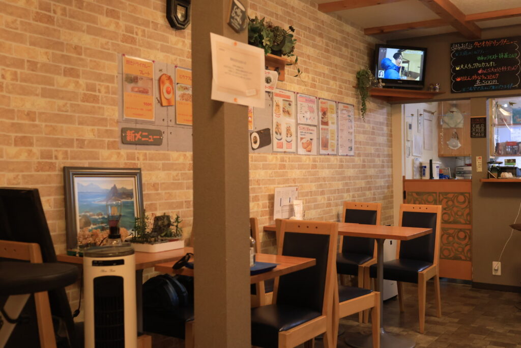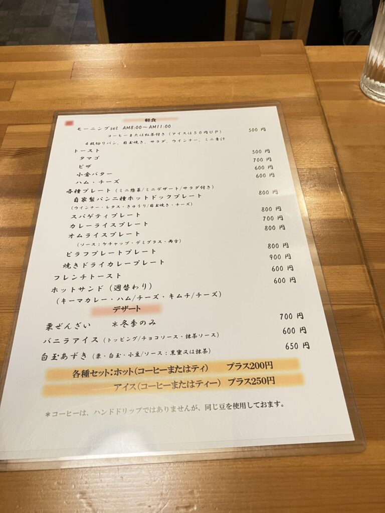 店内は4人席×4となっています。カウンターには椅子が3つありますが使われてないようです。こちらのモーニングは1種類でドリンクはコーヒーか紅茶からの選択で、アイスは+50円となっています。