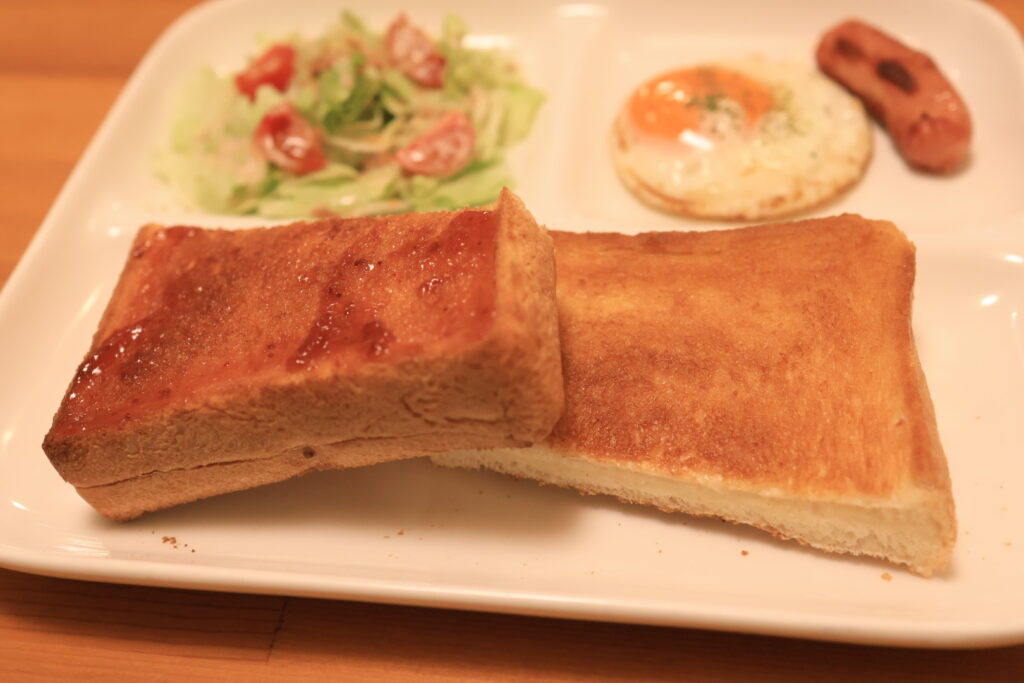 トーストは5枚切りくらいの厚みで2分割されています。耳は全て付いています。片方にジャム、片方にバターが塗ってあります。しっかり焼かれていて、カリカリ、パリパリの食感が楽しめて美味しいですね。