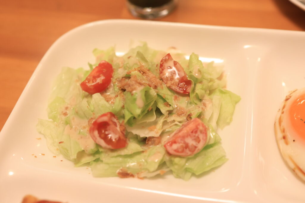 サラダはレタス、トマト、オニオンチップに胡麻ドレッシングがかかっています。割とボリュームがあります。