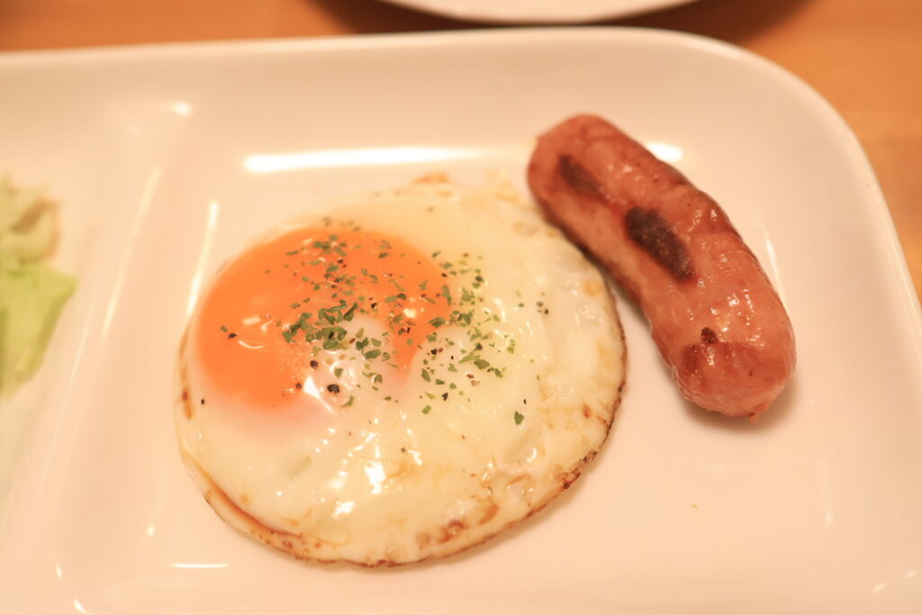目玉焼きとウインナー、目玉焼きは半熟部分が多めです。ウインナーには隠し包丁が入っていて、切れやすくなっています。
