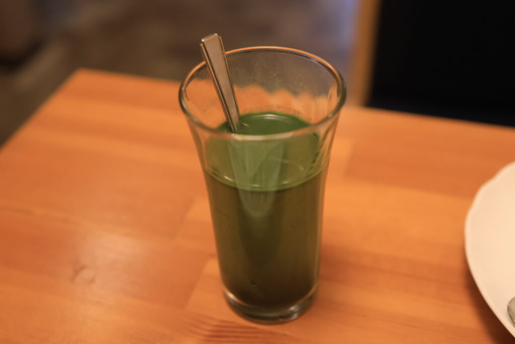 まず食前のミニ青汁が出てきました。・・・モーニングに青汁っていうのは初めてですね。・・・スプーンでよく混ぜてから飲むと・・・わずかな甘みを感じるあっさりとした味わいです。苦みは全くありません、飲みやすい青汁です。