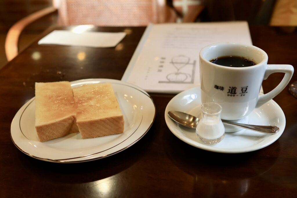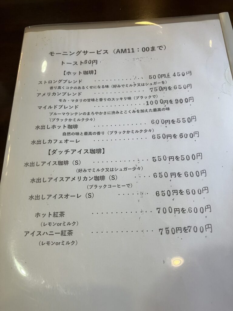 店内は3人席×1、4人席×2、8~10人くらいの大テーブル×1となっています。カウンター席はありません。100g~コーヒー豆の販売もされていますが、1980年代のビンテージの豆も販売されているようです・・・値段はやはりお高いですね・・・モーニングタイムは各種飲み物が割引になり、またトーストを+80円で付けることが出来ます。