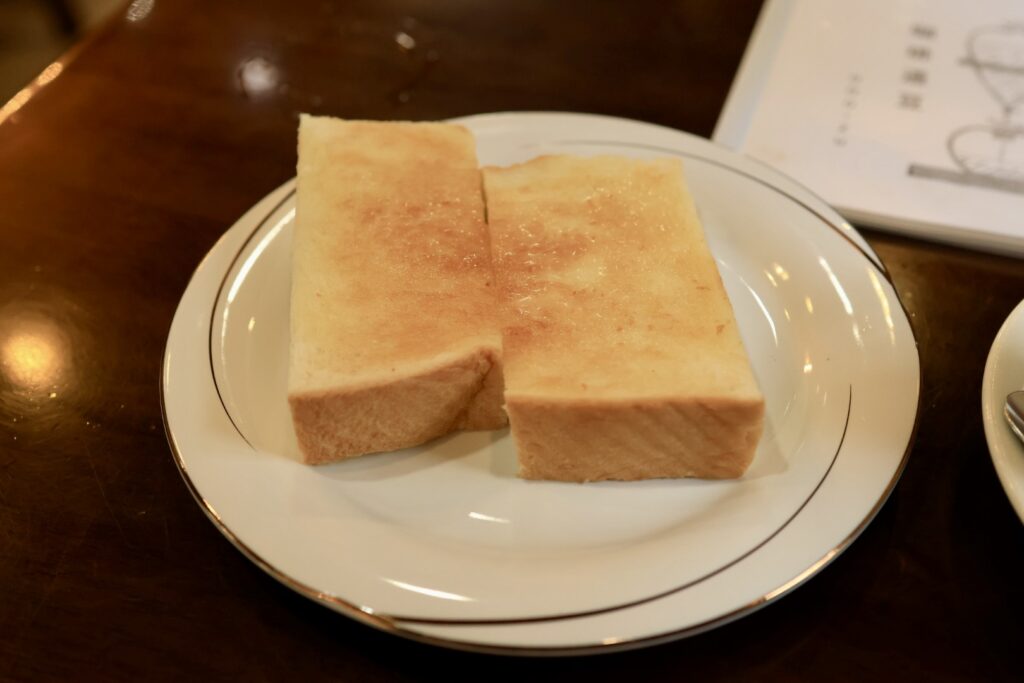 トーストは6枚切りくらいの厚みで2分割されています。耳は3辺カットされていて、バターがたっぷり塗ってあります。