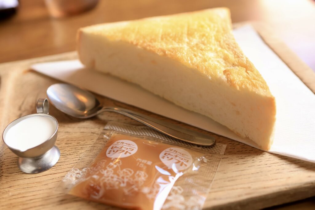 ワンプレートでの提供、ゆで卵がコーヒーカップに隠れていますね。トーストはハーフですが、4枚切りくらいの厚みがあり、隠し包丁が入っています。サクッとした歯応えです。ピーナッツバターが添えられるのが珍しいです。