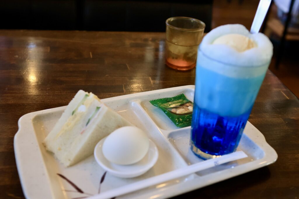 クリームソーダは青色でした、甘さに癒されます。お供についてきたのはサンドイッチ(玉子とハム1切ずつ)とゆで卵、柿ピーの小袋です。美味しく頂きましたが・・・モーニングとは違うこれは一体何なのか?