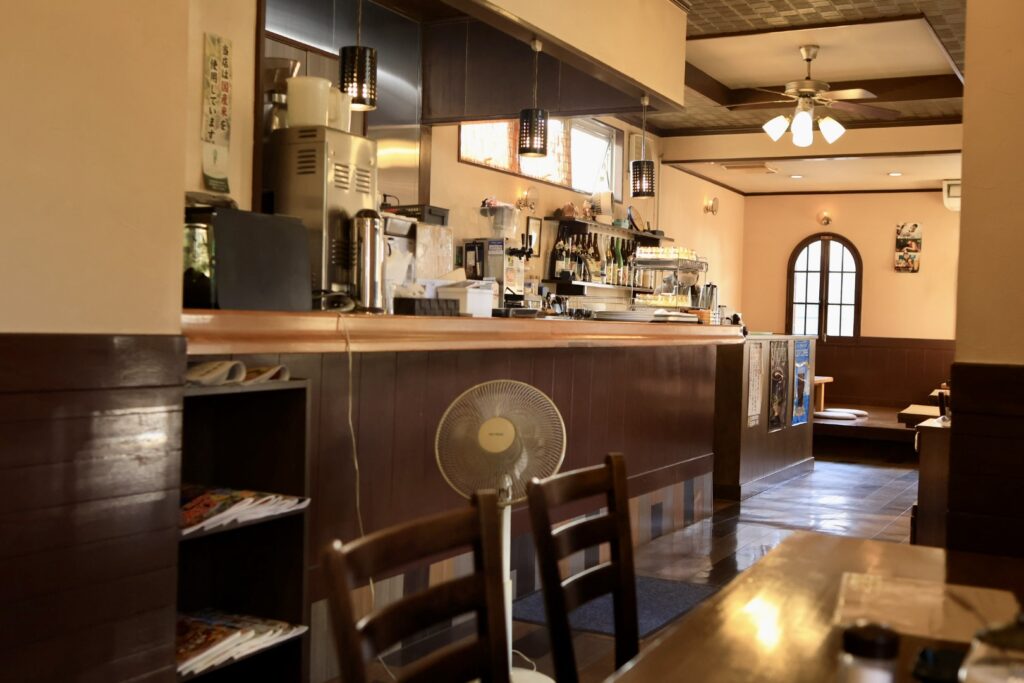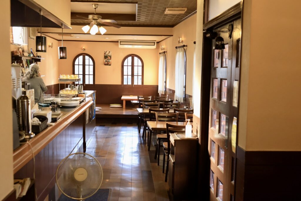 産業道路沿いのレトロな建物です。中に入ると店内はカウンター席なし、4人用テーブル×6、お座敷席4人用×2となっています。