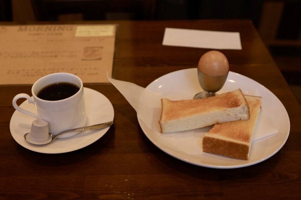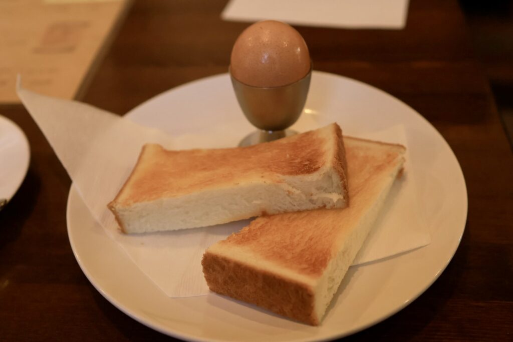 トーストは6枚切りくらいの厚みで2分割されています。耳が2辺カットされています。ゆで卵がエッグスタンドで提供されます、これはちょっと気分が上がりますね。