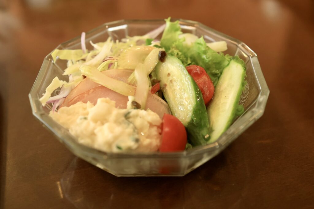 サラダはポテトサラダにハム、キュウリ、トマト、セロリ、キャベツ、玉ねぎ、レタスが入っており、オニオンドレッシングがかかっています。ゆで卵は剥きやすいです。