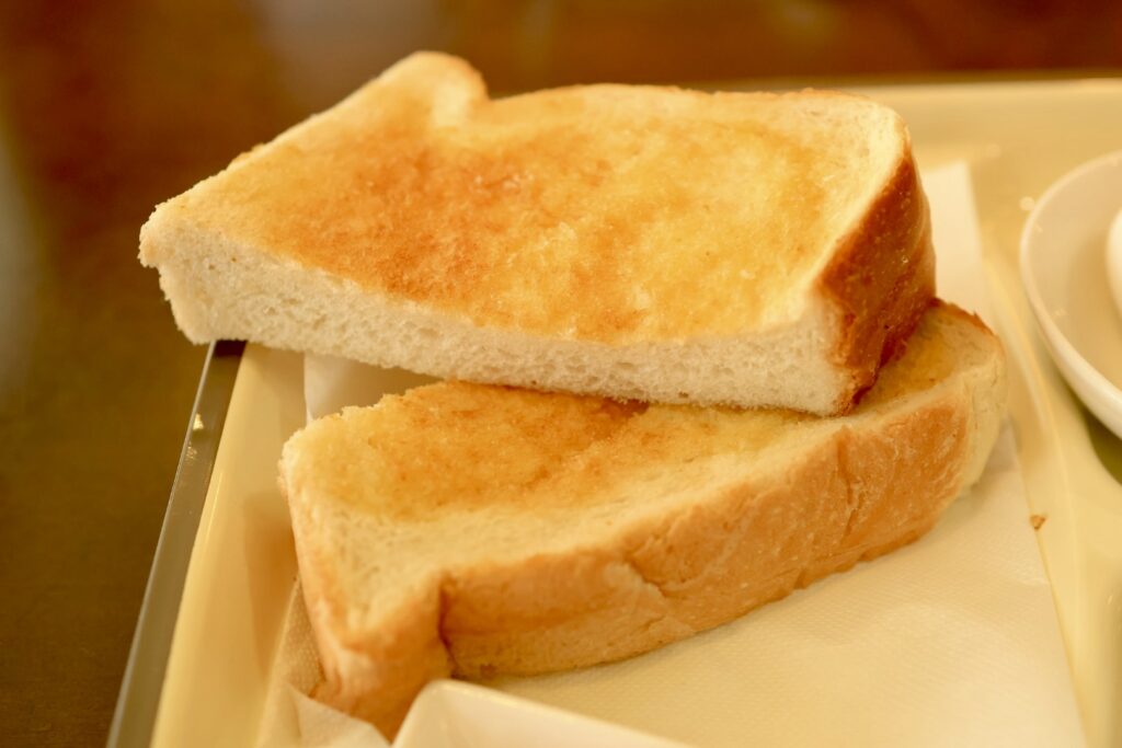 トーストは5枚切りくらいの厚みで2分割されています。耳は全て付いています。バターが染みて柔らかな口当たり。噛めば噛むほどに小麦の味を感じます。実は今日のパンは普段提供している山食とは違い、マスターさんおススメのパンが手に入ったのでそれを出してもらったようです。このパンは現在伊丹市昆陽にお店を構えるクランツさんのパンとのこと。マスターさん曰く、クランツさんは昔は各所に支店があって新伊丹の方にもあったのよと教えて頂きました。