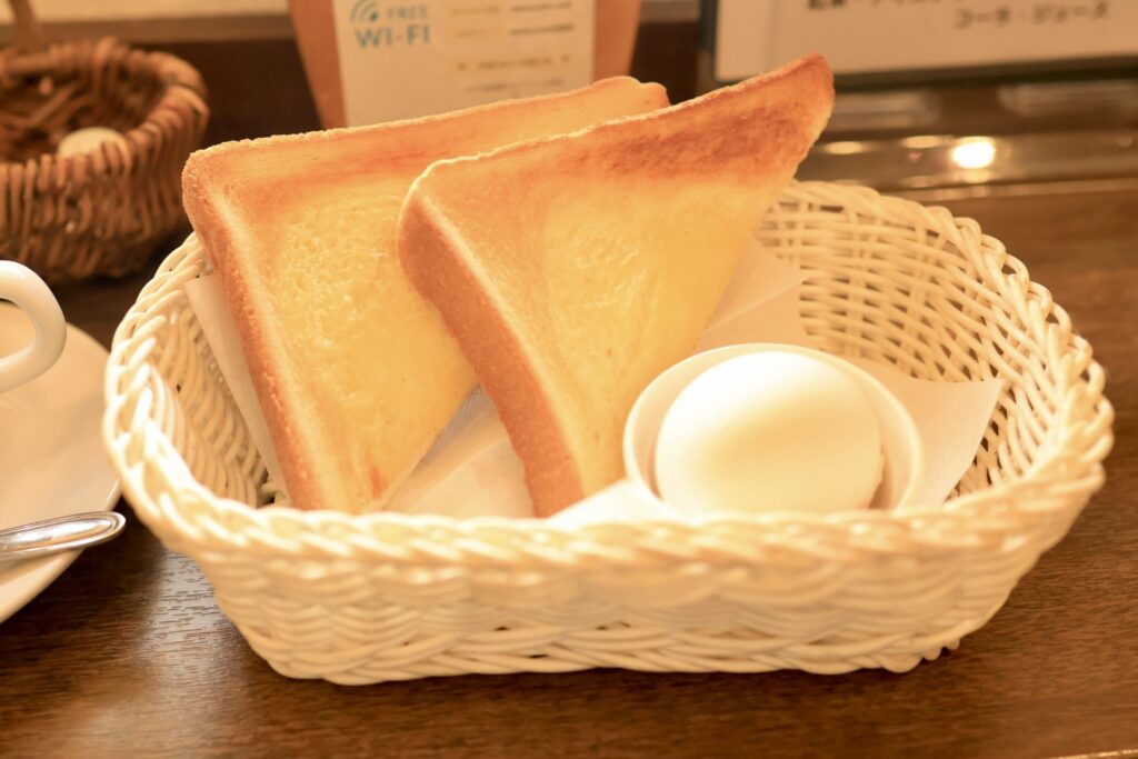 トーストは6枚切りくらいの厚みで2分割されています。耳は全て付いています。カリカリに焼かれていて、私好みの焼き加減です。ゆで卵は剥きやすいです。
