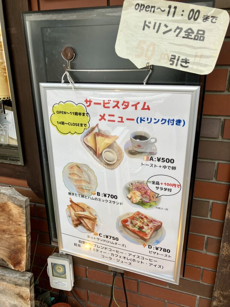 こちらのモーニングは4種類です、+100円でサラダが付けられます。変わっているのがモーニングタイムではない時間帯(14:00~L.O)にもサービスセットとしてモーニングと同じメニューが同じ価格でいただけるとのこと、これはすごい!