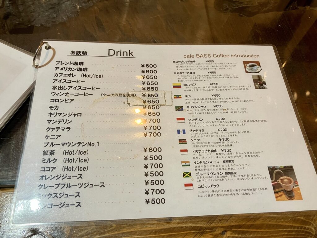 珈琲専門店だけあってコーヒーの種類は豊富です、ストレートコーヒーが概ね650円~700円の価格で提供されています。一部値段の記載の無いコーヒーもありますが、時価ってことでしょうか。ほのかに漂う焙煎の香りがたまりません。